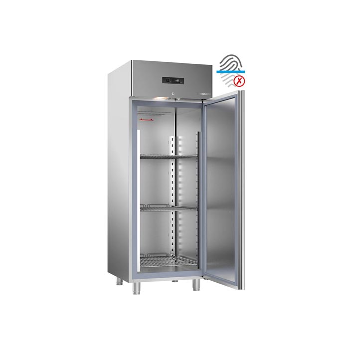 Frigorifero realizzato con struttura monoscocca interna ed esterna realizzata in acciaio speciale anti-impronta. Camera di conservazione dotata di cremagliere in acciaio inox AISI 304, 21 posizioni. Sistema di refrigerazione ventilato, evaporatore esterno al vano. Pannello comandi con termometro-termostato digitale. Sbrinamento elettrico. In dotazione per vano: n. 3 coppie di guide in acciaio inox AISI 304 e n.3 griglie plastificate. Dimensioni: 75x80x204 cm