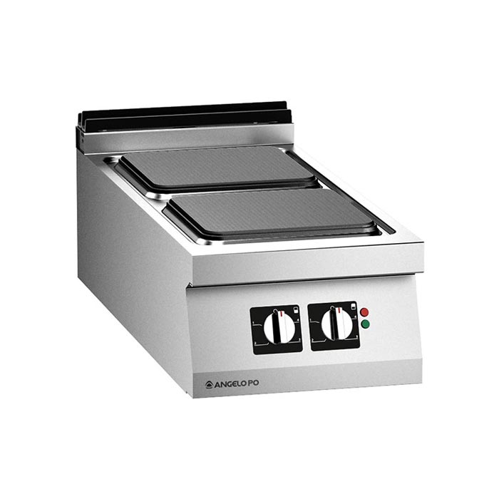 Cucina con piastre elettriche realizzata in acciaio inox AISI 304, spessore piano di lavoro 20/10 mm. Struttura autoportante. Piastre di cottura in ghisa a tenuta di liquidi, dotate di dispositivo di protezione termica. Ogni piastra è azionata da un commutatore a 5 posizioni. Predisposizione per il controllo remoto del taglio di picco di potenza. Dimensioni: 40x92x25 cm