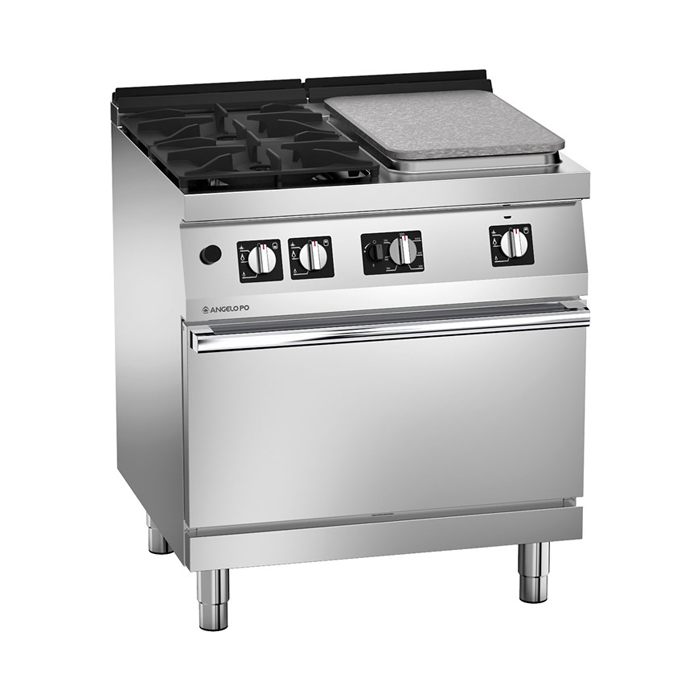 Cucina gas realizzata in acciaio inox AISI 304, spessore piano di lavoro 20/10 mm. Griglie di piano e bruciatori in ghisa smaltata. Bruciatori smontabili con spartifiamma a doppia corona azionati da rubinetto valvolato. Spia pilota e termocoppia. Invaso sottobruciatori stampato a tenuta di liquidi. Piastra radiante sul piano a destra. Forno gas statico in acciaio inox AISI 430 termostatato, guide inox smontabili, capacità contenitori GN 2/1. Dimensioni 80X72X90