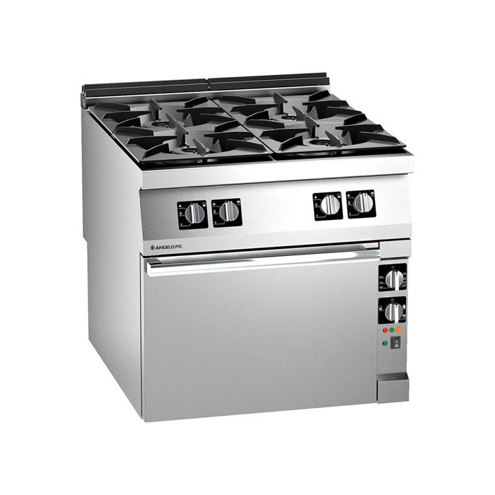 Cucina gas realizzata in acciaio inox AISI 304, spessore piano di lavoro 20/10 mm. Griglie di piano e bruciatori in ghisa smaltata. Bruciatori smontabili con spartifiamma a doppia corona azionati da rubinetto valvolato. Spia pilota e termocoppia. Invaso sottobruciatori stampato a tenuta di liquidi. Forno elettrico pluri-ventilato in acciaio inox AISI 430 termostatato, guide inox smontabili, capacità contenitori 2/1GN.. Dimensioni: 80x92x75 cm