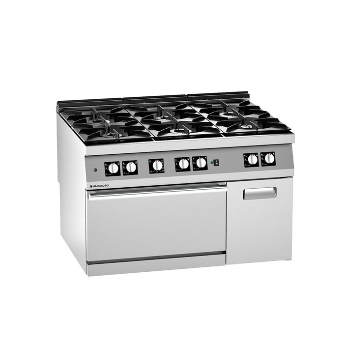Cucina gas realizzata in acciaio inox AISI 304, spessore piano di lavoro 20/10 mm. Griglie di piano e bruciatori in ghisa smaltata. Bruciatori smontabili con spartifiamma a doppia corona e mono-corona azionati da rubinetto valvolato. Spia pilota e termocoppia. Invaso sottobruciatori stampato a tenuta di liquidi. Forno gas pluri-ventilato in acciaio inox AISI 430 termostatato con guide inox smontabili, capacità contenitori 2/1GN. Vano laterale con guide portateglie 1/1GN. Dimensioni: 120x92x75 cm