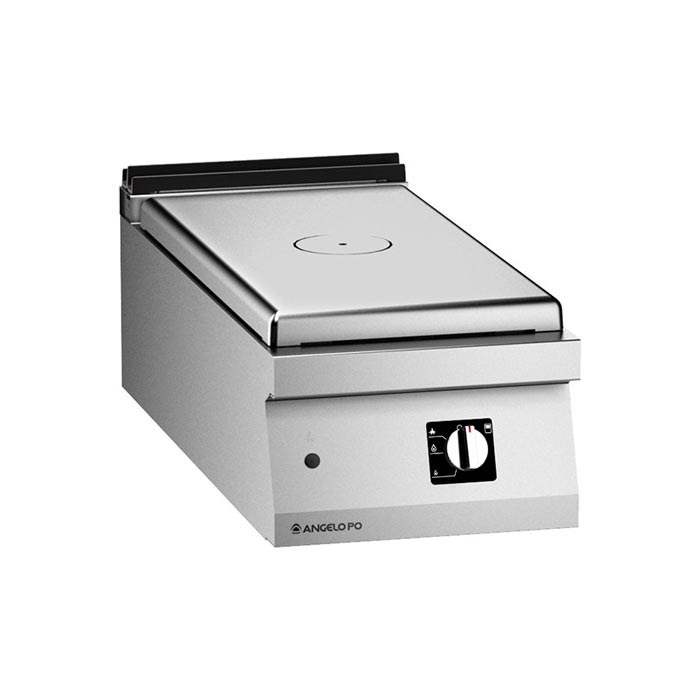 Cucina tuttapiastra realizzata in acciaio inox AISI 304, spessore piano di lavoro 20/10 mm. Piastra radiante in ghisa. Riscaldamento tramite bruciatore centrale tubolare inox comandato da rubinetto valvolato con spia pilota, termocoppia. Accensione elettronica a treno di scintille. Dimensioni: 40x92x25 cm
