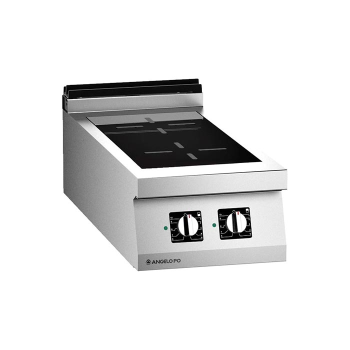 Cucina con piano in vetroceramica realizzata in acciaio inox AISI 304, spessore piano di lavoro 20/10 mm. Piano di cottura con vetroceramica, inserito a filo e sigillato a tenuta di liquidi. Riscaldamento ad induzione. 2 zone di cottura indipendenti. Sensori di riconoscimento pentola e dispositivi automatici di controllo. Raffreddamento forzato dei componenti elettronici. Utilizzare pentole (Ø minimo 120 mm) in materiale idoneo per l’induzione. Dimensioni: 40x92x25 cm