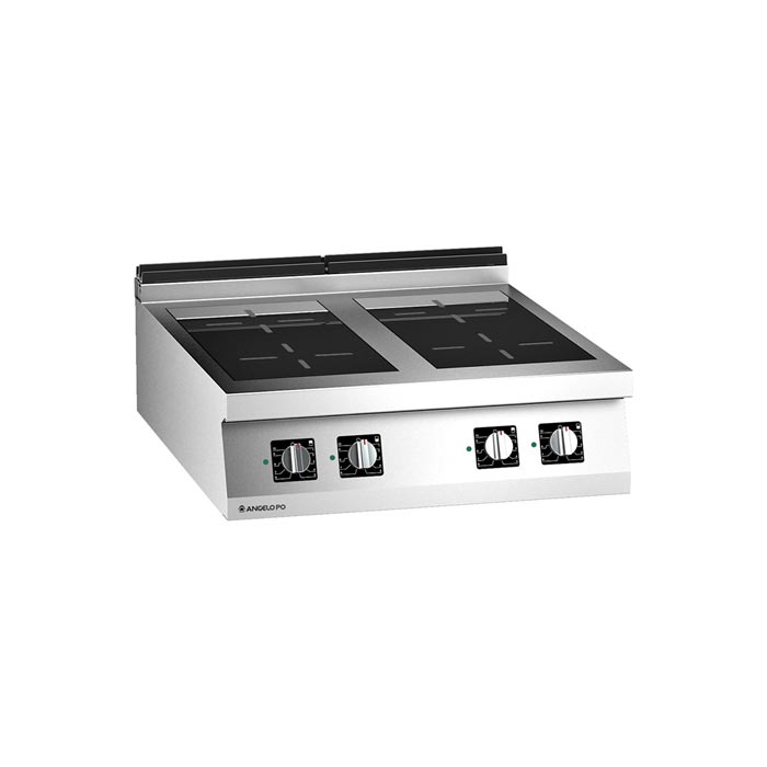 Cucina con piano in vetroceramica realizzata in acciaio inox AISI 304, spessore piano di lavoro 20/10 mm. Piano di cottura con vetroceramica, inserito a filo e sigillato a tenuta di liquidi. Riscaldamento ad induzione. 4 zone di cottura indipendenti. Sensori di riconoscimento pentola e dispositivi automatici di controllo. Raffreddamento forzato dei componenti elettronici. Utilizzare pentole (Ø minimo 120 mm) in materiale idoneo per l’induzione. Dimensioni: 80x92x25 cm