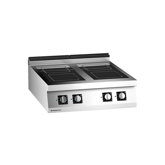 Cucina con piano in vetroceramica realizzata in acciaio inox AISI 304, spessore piano di lavoro 20/10 mm. Piano di cottura con vetroceramica, inserito a filo e sigillato a tenuta di liquidi. Riscaldamento ad induzione. Tuttazona, con 4 zone di cottura indipendenti. Sensori di riconoscimento pentola e dispositivi automatici di controllo. Raffreddamento forzato dei componenti elettronici. Utilizzare pentole (Ø minimo 120 mm) in materiale idoneo per l’induzione. Dimensioni: 80x92x25 cm