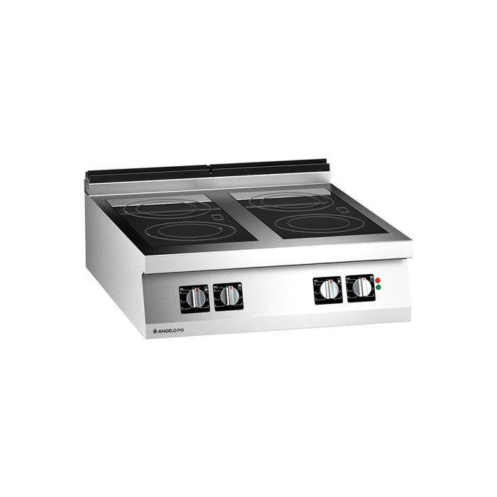 Cucina con piano in vetroceramica realizzata in acciaio inox AISI 304, spessore piano di lavoro 20/10 mm. Piano di cottura con vetroceramica, inserito a filo e sigillato a tenuta di liquidi. Riscaldamento tramite resistenze ad infrarosso. 4 zone di cottura indipendenti comandate da regolatore di energia. Predisposizione per il controllo remoto del taglio di picco di potenza. Dimensioni: 80x92x25 cm