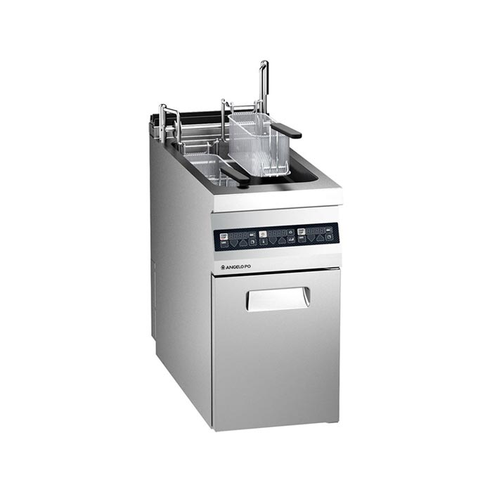 Friggitrice realizzata in acciaio inox AISI 304, spessore piano 20/10 di mm. Vasca stampata integrata al piano, a tenuta, con ampie raggiature e zona di decantazione; in dotazione per vasca: 2 cestelli e 1 coperchio. Comandi digitali. Scheda elettronica per controllo e visualizzazione temperatura 0-190°C, programma di melting e mantenimento a 100°C, allarme sonoro, sollevamento automatico del cestello. Resistenze ribaltabili all’ interno della vasca. Predisposizione per il controllo remoto del taglio di picco di potenza. Dimensioni: 40x92x90 cm