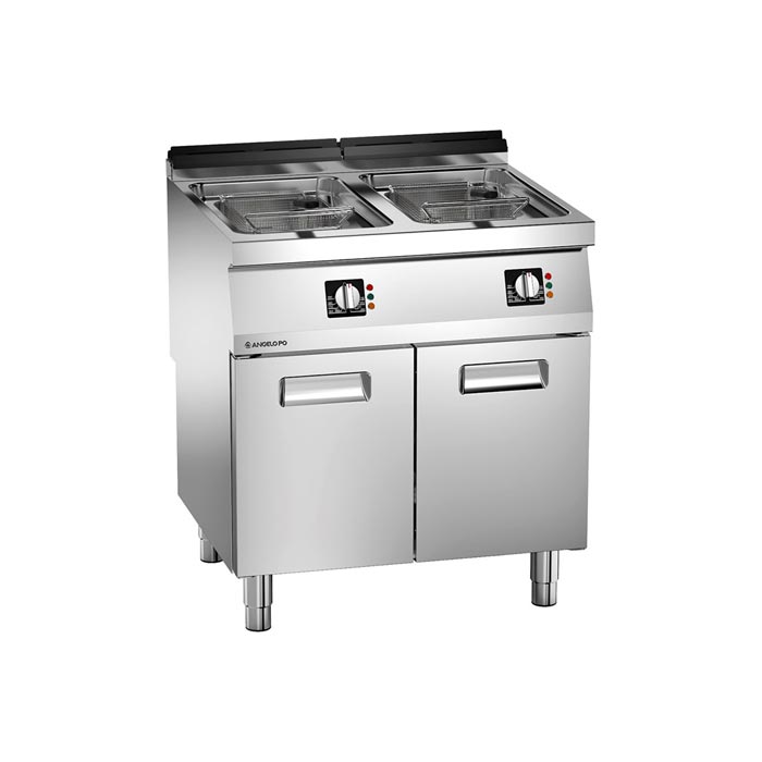 Friggitrice realizzata in acciaio inox AISI 304, spessore piano 20/10 di mm. Vasche stampate integrate al piano, a tenuta, con ampie raggiature e zona di decantazione; in dotazione per vasca: 1 cestello e 1 coperchio. Comandi meccanici. Controllo temperatura con termostato 100-190°C. Resistenze ribaltabili all’ interno della vasca. Predisposizione per il controllo remoto del taglio di picco di potenza. Dimensioni 80x72x90 cm