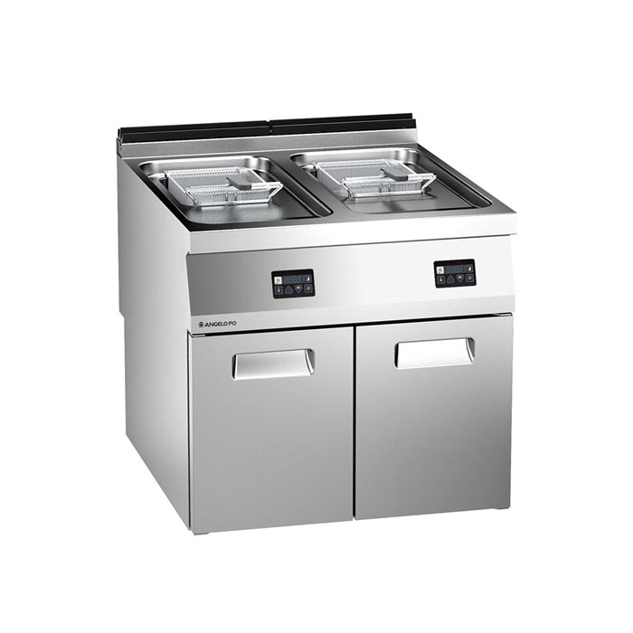 Friggitrice realizzata in acciaio inox AISI 304, spessore piano 20/10 di mm. Vasche stampate integrate al piano, a tenuta, con ampie raggiature e zona di decantazione; in dotazione per vasca: 1 cestello e 1 coperchio. Comandi digitali. Scheda elettronica per controllo e visualizzazione temperatura 0-190°C, programma di melting e mantenimento a 100°C, allarme sonoro. Resistenze ribaltabili all’ interno della vasca. Predisposizione per il controllo remoto del taglio di picco di potenza. Dimensioni: 80x92x75 cm