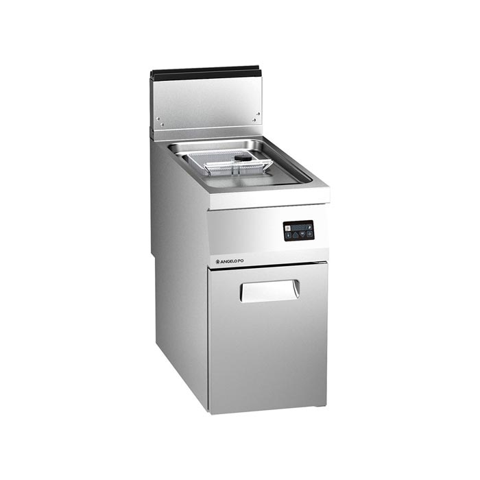 Friggitrice realizzata in acciaio inox AISI 304, spessore piano 20/10 di mm. Vasca stampata integrata al piano, a tenuta, con ampie raggiature e zona di decantazione; in dotazione per vasca: 1 cestello e 1 coperchio. Comandi digitali. Scheda elettronica per controllo e visualizzazione temperatura 0-190°C, programma di melting e mantenimento a 100°C, allarme sonoro. Bruciatori tubolari in vasca. Accensione elettronica a treno di scintille, termostato di sicurezza. Dimensioni: 40x92x75 cm