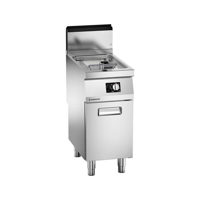 Friggitrice realizzata in acciaio inox AISI 304, spessore piano 20/10 di mm. Vasca a “V” – priva di tubi di fumo – stampata integrata al piano, a tenuta, con ampie raggiature e zona di decantazione; in dotazione per vasca: 1 cestello e 1 coperchio. Comandi meccanici. Controllo temperatura con termostato 100-190°C. Bruciatori tubolari esterni alla vasca. Accensione piezo-elettrica della spia pilota, termostato di sicurezza. Dimensioni 40x72x90 cm