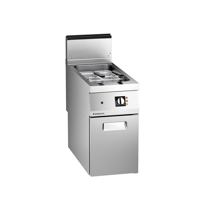 Friggitrice realizzata in acciaio inox AISI 304, spessore piano 20/10 di mm. Vasca stampata integrata al piano, a tenuta, con ampie raggiature e zona di decantazione; in dotazione per vasca: 2 cestelli e 1 coperchio. Comandi meccanici. Controllo temperatura con termostato 100-185°C. Bruciatori tubolari in vasca. Accensione elettronica a treno di scintille, controllo fiamma a IONIZZAZIONE, termostato di sicurezza. Dimensioni: 40x92x75 cm