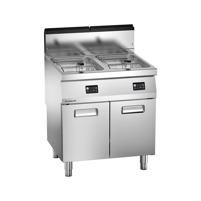 Friggitrice realizzata in acciaio inox AISI 304, spessore piano 20/10 di mm. Vasche stampate integrate al piano, a tenuta, con ampie raggiature e zona di decantazione; in dotazione per vasca: 1 cestello e 1 coperchio. Comandi digitali. Scheda elettronica per controllo e visualizzazione temperatura 0-190°C, programma di melting e mantenimento a 90°C, allarme sonoro di fine cottura. Bruciatori tubolari in vasca. Accensione elettrica a treno di scintille, termostato di sicurezza. Dimensioni 80x72x90 cm