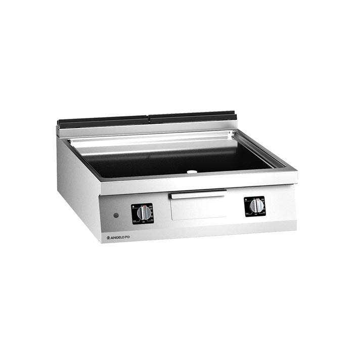 Fry-top realizzato in acciaio inox AISI 304, spessore piano di lavoro 20/10 mm. Piastra di cottura in compound (AISI 316L+FE). In dotazione: tappo piastra. Riscaldamento tramite due batterie di bruciatori indipendenti comandati da valvola termostatica ad azione modulante. Temperatura di lavoro (min-max): 120-320°C. Dimensioni: 80x92x25 cm