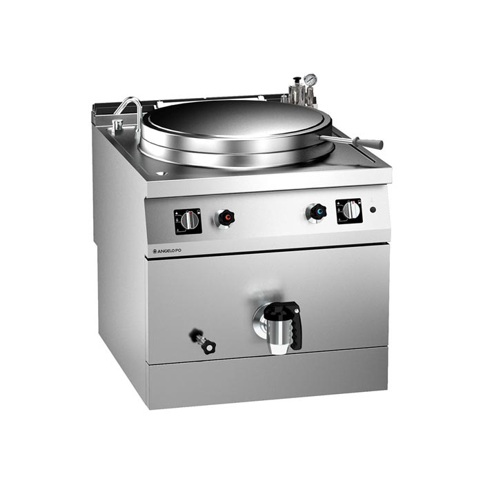 Pentola realizzata in acciaio inox AISI 304, spessore piano 20/10 di mm. Recipiente di cottura con fondo in acciaio inox AISI 316L e pareti in acciaio inox AISI 304. Riscaldamento tramite due bruciatori indipendenti comandati da rubinetti valvolati, spia pilota e termocoppia. Generazione di vapore a bassa pressione all’interno dell’intercapedine. Coperchio incernierato posteriormente e bilanciato. Dimensioni: 80x92x75 cm